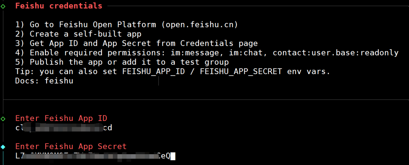10. Enter your Feishu App ID and App Secret.